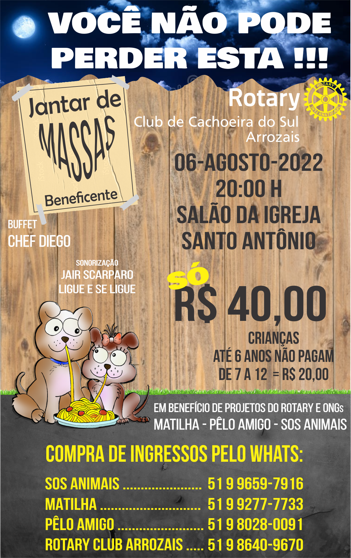 Jantar em benefício de Projetos do Rotary e as ONGs: Matilha - Pêlo amigo - SOS Animais