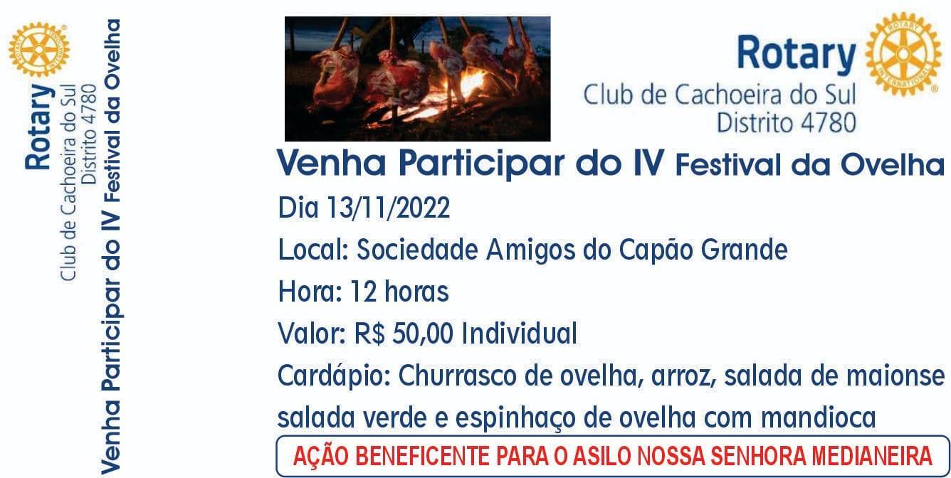 No dia 13 de Novembro de 2022 o Rotary Club de Cachoeira do Sul promoverá o seu IV Festival da Ovelha.