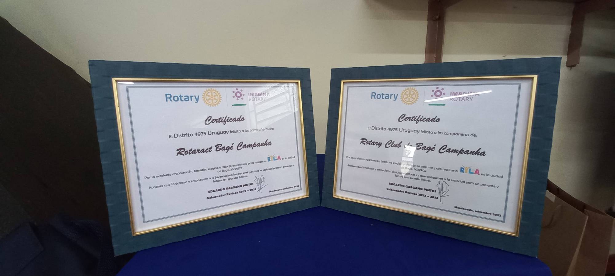 Reconhecimento do Rotary Uruguay aos Clubes de Bagé, pela organização e participação do Ryla Bagé, ocorrido no final de setembro 22.
