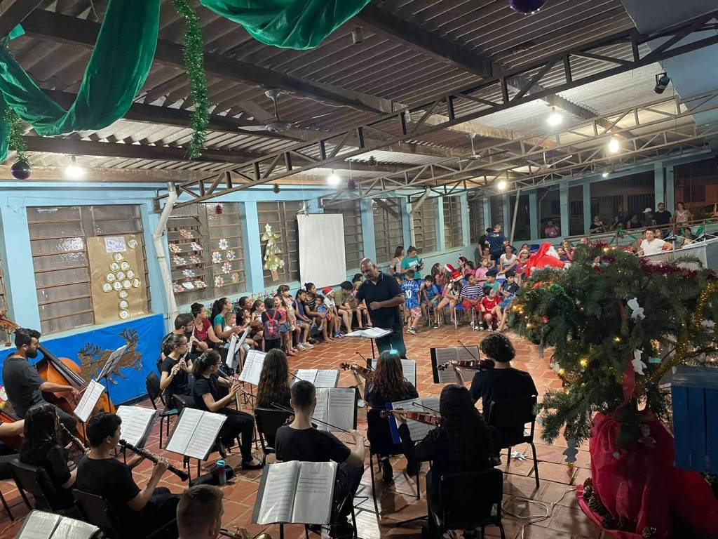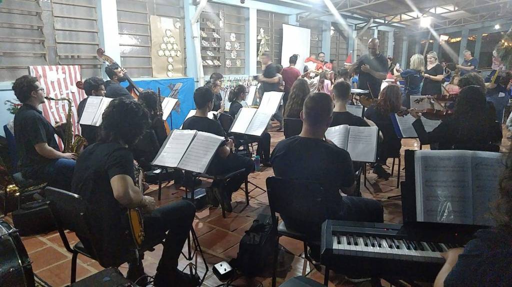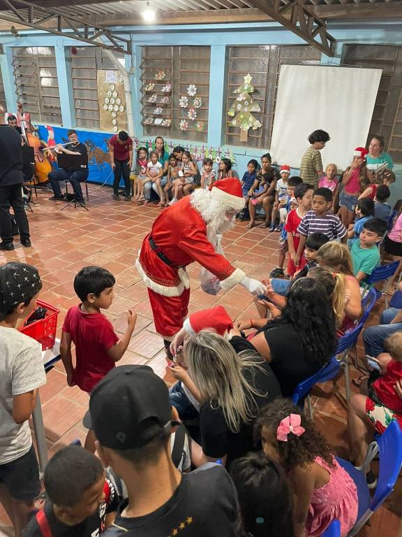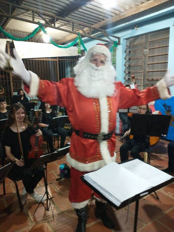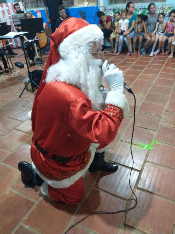 Durante a apresentação da Orquestra, ocorreu o momento tão aguardado: a chegada do Papai Noel, para delírio das crianças presentes.