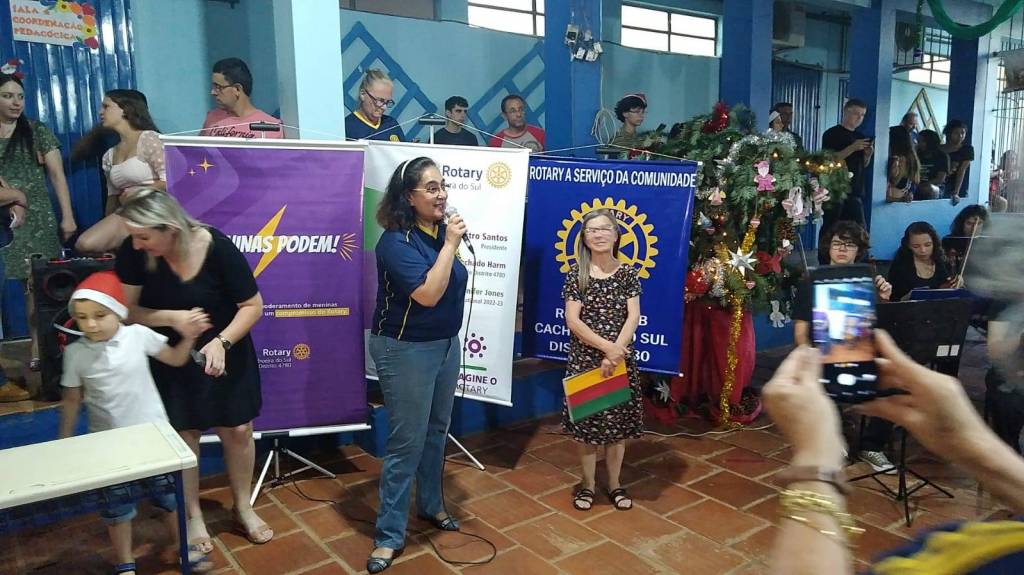 A Presidente do Rotary Club de Cachoeira do Sul, Fatima Beatriz de Castro Santos, agradeceu à todos pela presença e pela recepção que a Escola Marieta proporcionou ao Natal Rotary Cachoeira do Sul na Comunidade, salientando a necessidade de uma contínua parceria entre o Clube e a comunidade escolar para o ano de 2023.