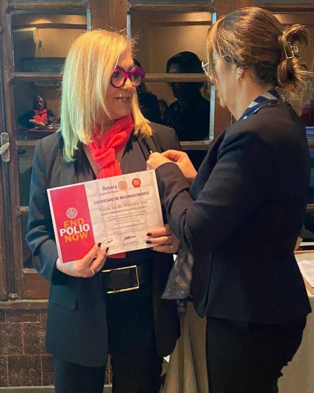 Finalizando a noite de homenagens, foi entregue o Certificado de Reconhecimento - Sócio Fundador PolioPlus Society a nossa querida Governadora e companheira Dóris Vaz.