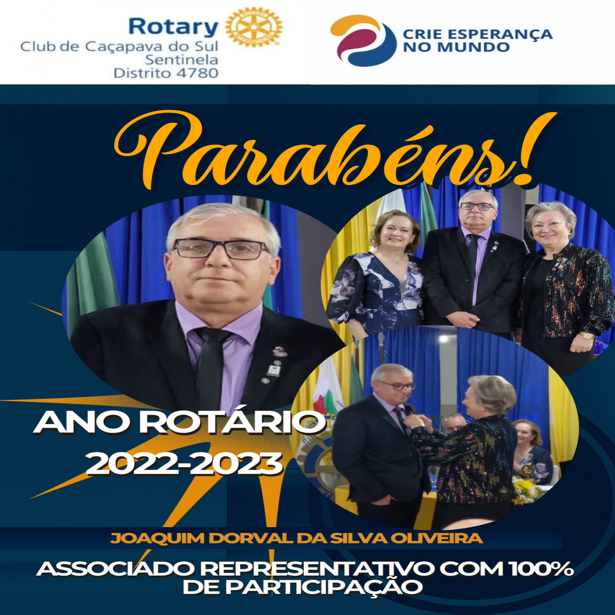 O Rotary Club de Caçapava do Sul-Sentinela parabeniza o companheiro Joaquim Dorval da Silva Oliveira por ter participado de 100% das reuniões do ano 2023-2023