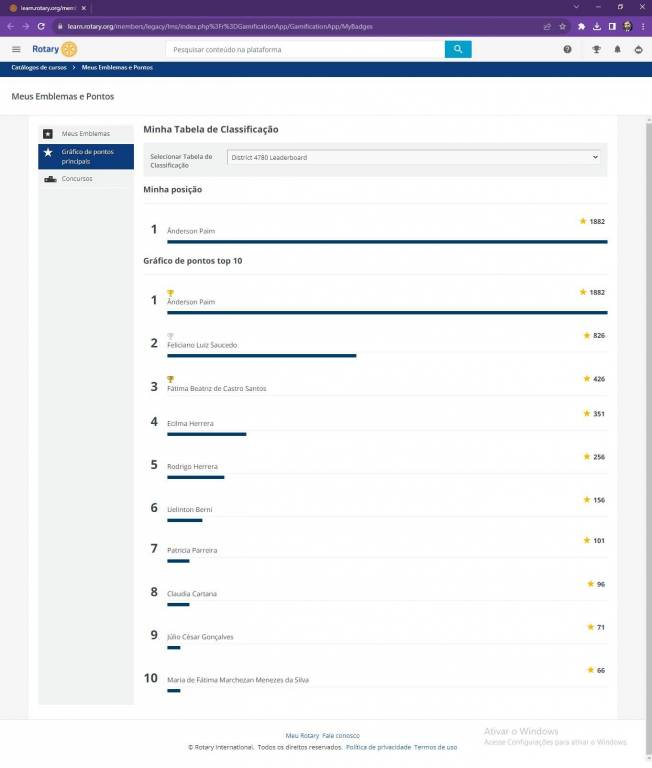 O Companheiro Ânderson Paim está no Gráfico de pontos top 10 do Distrito 4780. Titulo conquistado atraves da central de aprendizado do My Rotay, Apos ter efetuado todos os Cursos on-lain disponiveis no Catálogos de cursos.