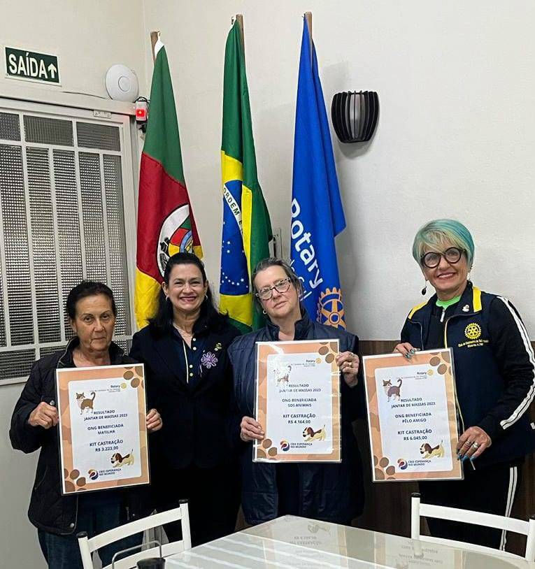 "Durante reunião, no dia 15, o Rotary Club de Cachoeira do Sul Arrozais fez a divulgação do resultado do Jantar de Massas, que foi realizado dia 05 de agosto de 2023. O momento contou com a presença das representantes das ONGs que trabalham para a causa animal e foram parceiras do jantar. Representando a ONG Matilha Dilma Machado e da ONG SOS Animais Valdívia. O resultado final do jantar foi de R$ 16. 782, 02, onde 20% ficam para projetos do Clube e o restante distribuído para as ONGs parceiras, de acordo com o número de ingressos vendidos por cada uma. O valor passado, ficou assim distribuído: ONG Matilha recebeu R$3.223,00, a ONG SOS Animais R$ 4.164,00 e Pêlo Amigo R$ 6.045,00. Esses valores serão usados para abrir crédito nas clínicas indicadas pelas ONGs, com valor destinado para castração. As castrações serão feitas em animais de rua. O número de animais em situação de abandono é muito grande, essa é forma de contribuir para a redução desses animais. Também contribuir com a saúde pública.
