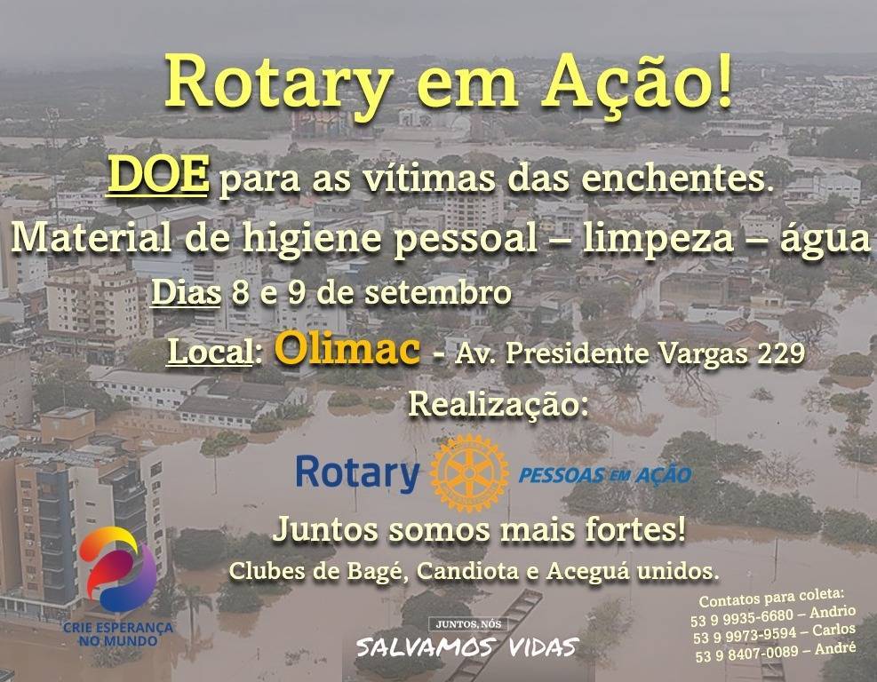 Os Clubes da área 7 do Distrito 4780 de Rotary Internacional, realizam campanha de arrecadação de material, para ajuda aos atingidos pela enchente no Rio Grande do Sul. Com o propósito de ajudar as comunidades atingidas e que enfretam um momento dificil. Contamos com a coloboração da comunidade .