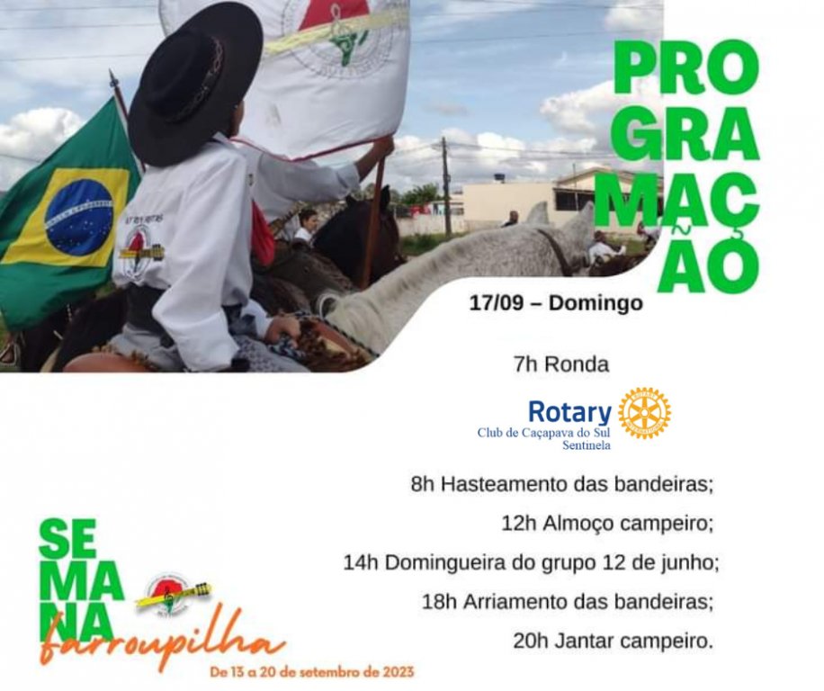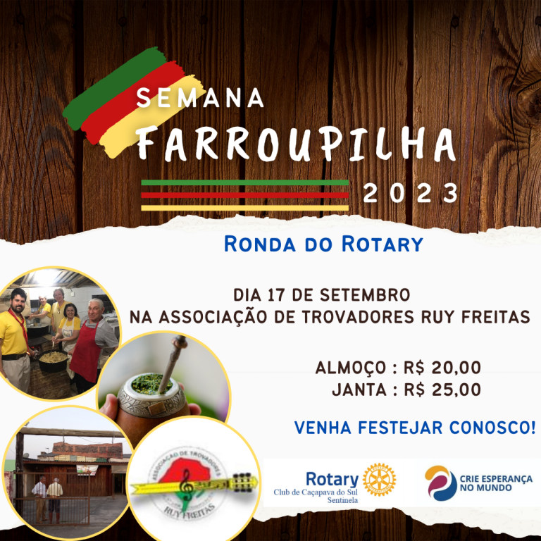 Em parceria com a Associação de Trovadores Ruy Freitas, dia 17 de setembro, o Rotary Club de Caçapava do Sul-Sentinela, preparou mais de 200 refeições, servidas durante o almoço e jantar, para a comunidade local, que veio prestigiar os festejos da semana Farroupilha.