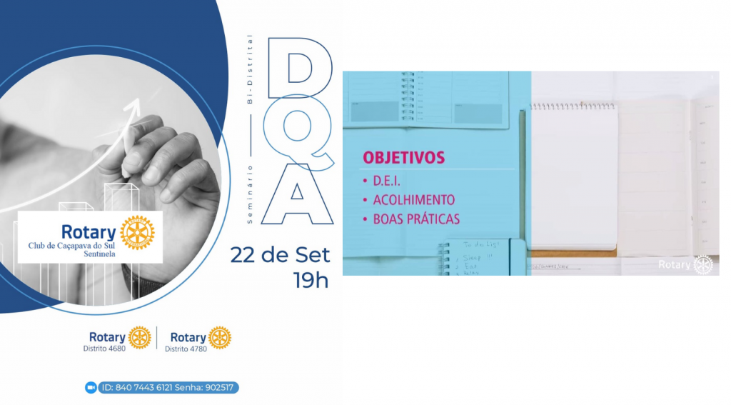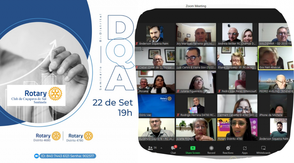 O 4780 foi o Distrito com maior participação no Seminário Bi-Distrital de DQA. Foram 80 companheiros de diversos clubes do Distrito que acompanharam o evento realizado de forma virtual na noite de sexta-feira, 21. Mais de 100 associados estiveram na transmissão via plataforma Zoom, que contou com a participação internacionais do Governador do Distrito 4975 do Uruguai.