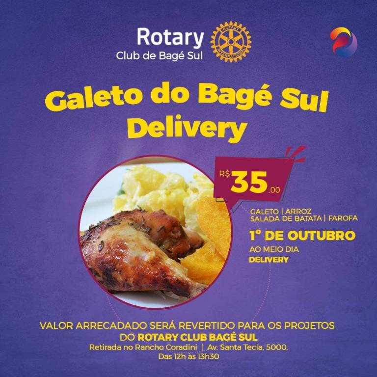 No dia 01/10/2023, o Rotary Club de Bagé Sul, realizou seu Galeto Solidário para arrecadar fundos com o objetivo de dar continuidade nos projetos em prol da comunidade. Esse ano o clube irá ajudar duas instituições: Casa da Menina e AAPECAN. Foi um dia maravilhoso com muito sol e com a participação de vários companheiros no evento.