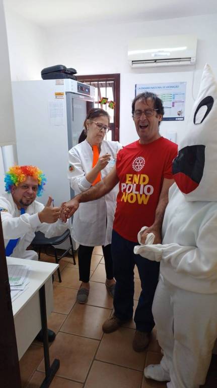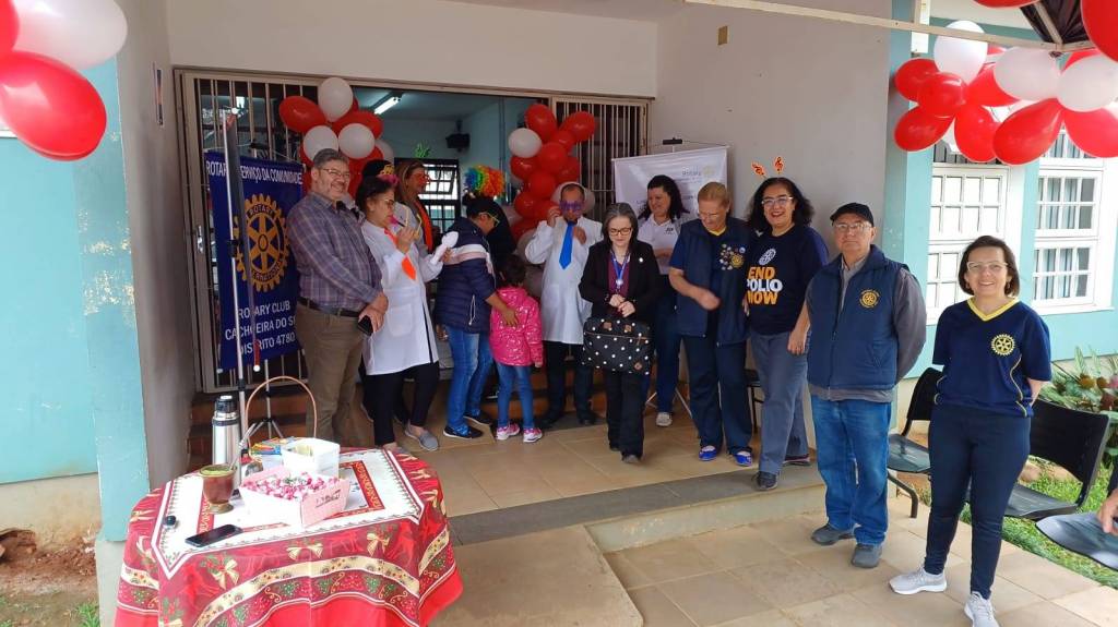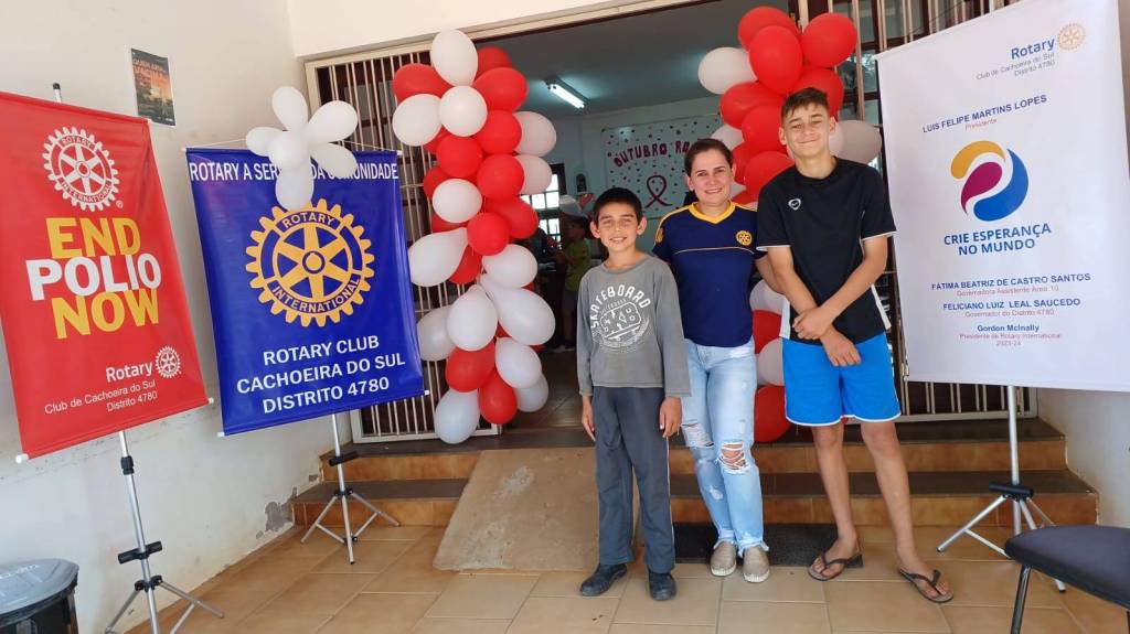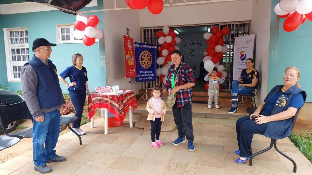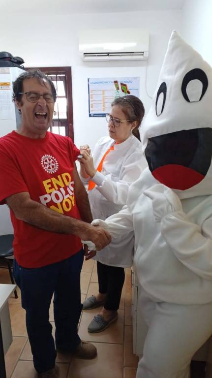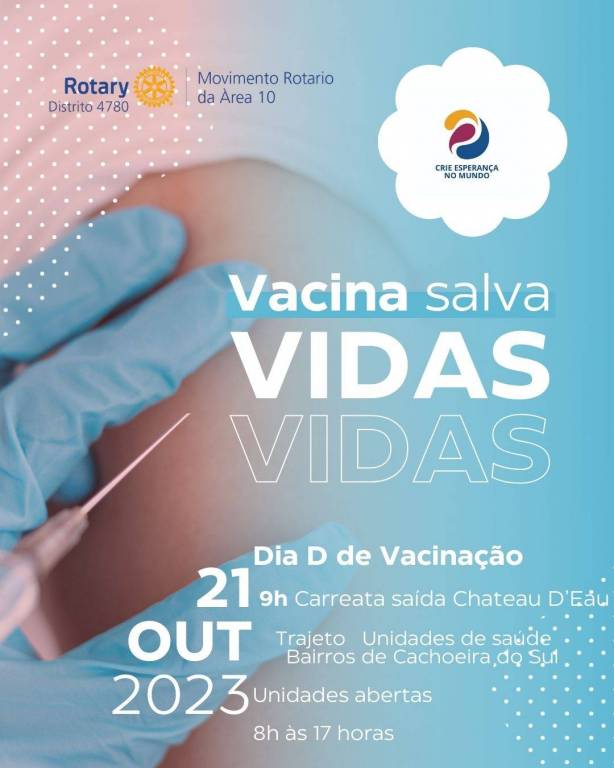 Sábado dia 21 de outubro de 2023,sábado de atenção total as unidades de saúde de Cachoeira do Sul e região:dia D de vacinação - Campanha Nacional de Multivacinação. Os associados do Rotary Club de Rotary de Cachoeira do Sul , Rotaract, Interact e Casa da Amizade,iniciaram seu sábado com uma carreata em prol da conscientização das vacinas,salientando que vacina salvam vidas.Todos os clubes de Cachoeira do Sul reuniram-se na praça central da cidade com o "Zé gotinha " para percorrer e e abrilhantar a cidade divulgando a campanha e chamando a atenção nos bairros para as unidades de saúde que estavam abertas para vacinação.Todos os sábados de outubro as unidades de saúde abriram pela manhã e, em especial, no dia D das 8h às 17horas sem intervalo ao meio dia, contando com o auxilio dos rotarianos, distribuidos em todas as unidades de saúde de Cachoeira do Sul. Muito lápis de cor, brinquedos, brincadeiras,balas e/ou pirolitos para o entretenimento da criançada enquanto aguardavam sua vez de vacinar...Ze Gotinha percorreu todas as unidades de saúde culminando na US14 unidade de responsabilidade dos associados do Rotary Club de Cachoeira dos Sul. A carreata foi coordenada pelo presidente do Rotary Club de Cachoeira do Sul Luis Felipe Martins Lopes e pela Governadora Assistente da área 10 do D 4780, Fátima Beatriz de Castro Santos também associada representativa do Rotary Club de Cachoeira do Sul.O dia D de Vacinação do Rotary Club de Cachoeira do Sul, culminou com uma mateada junto ao bairro da unidade de saúde US14 a fim de que os adultos que ali foram levar suas crianças também fossem agraciados ganhando erva mate e/ou fazendo e compartilhando seu chumarrão ali mesmo, junto a sua comunidade