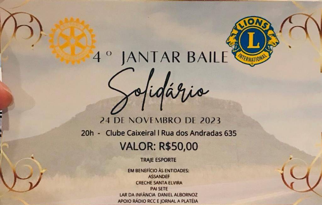 No dia 24 de novembro de 2023 será realizado o 4º Jantar Baile Solidário no Clube Caixeral na Rua dos Andradas nº 635 as 20h Traje Esporte em benefício às entidades ASSENDEF, CRECHE SANTA ELVIRA,PAI SETE, LAR DA INFÂNCIA DANIEL ALBORNOZ, com o apoio Rádio RCC e Jornal A PLATÉIA.