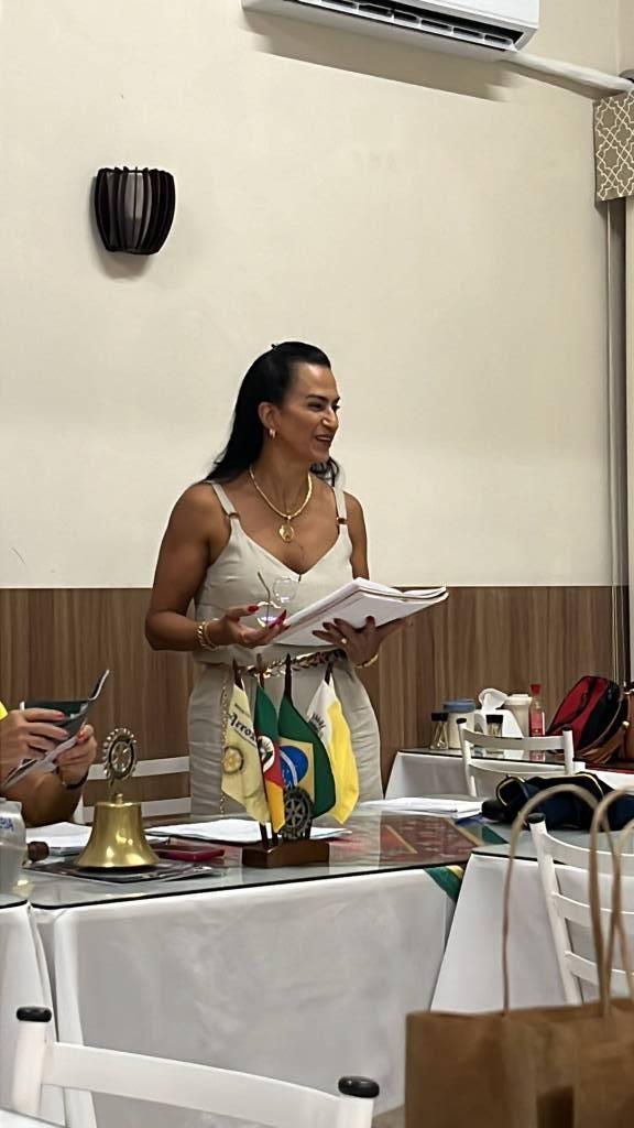 HELENARA DA ROSA, 65 anos, apresentou sua árvore genealógica, filha de Epitácio da Rosa e Dina Maria da Rosa, neta de italianos instalados na Quarta Colônia. Nasceu em Cachoeira do Sul em 22/05/1958. A família mudou-se para São Gabriel e fez seus estudos lá; cursou a Escola Normal e graduação em Ciências Físicas e Biológicas, após Matemática e Mestrado em Tecnologia da Informação em Educação, na PUCRS. Hoje, aposentada, trabalhou 32 anos na escola pública e concomitante, em escola particular, na Rede Marista. Já pertenceu aos Lions. Teve a empresa Luz Viva eventos&festas, planejando, organizando e executando eventos em geral. Por 10 anos foi coordenadora da Feira Agropecuária de Cachoeira do Sul. Rotariana desde 2015, onde a Prova Quádrupla a define com verdade, justez, boa vontade, amizades e benefício, culminando com o servir sem olhar a quem. Agradeceu a oportunidade de pertencer ao Rotary Club de Cachoeira do Sul.