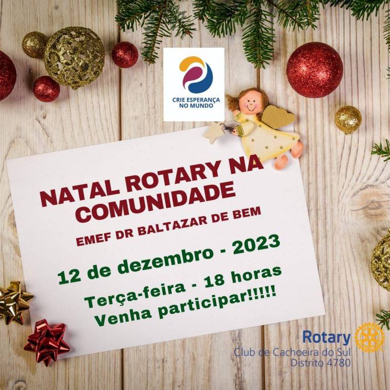 Na terça feira do dia 13 de dezembro de 2023, o Rotary Club de Cachoeira do Sul e a Escola Estadual de Ensino Fundamental Dr Baltazar de Bem oportunizaram à comunidade local mais uma edição do Natal Rotary na Comunidade, neste ano Rotário, 2023-24, coordenado pelo presidente Luis Felipe Martins Lopes. Música instrumental,capoeira, violões, flautas e a Banda Marcial foram as atrações para a grande preparação e chegada do Bom Velhinho Papai Noel.Balas, pipocas, algodão doce e muita alegria foram os ingredientes que transformaram cada olhar em harmonia e brilho de esperança por um mundo melhor. As crianças, pais, professores e todos os rotarianos ali presentes demonstraram que unidos em suas ações conseguem com momentos mágicos, transformar vidas e multiplicar a Esperança no Mundo.