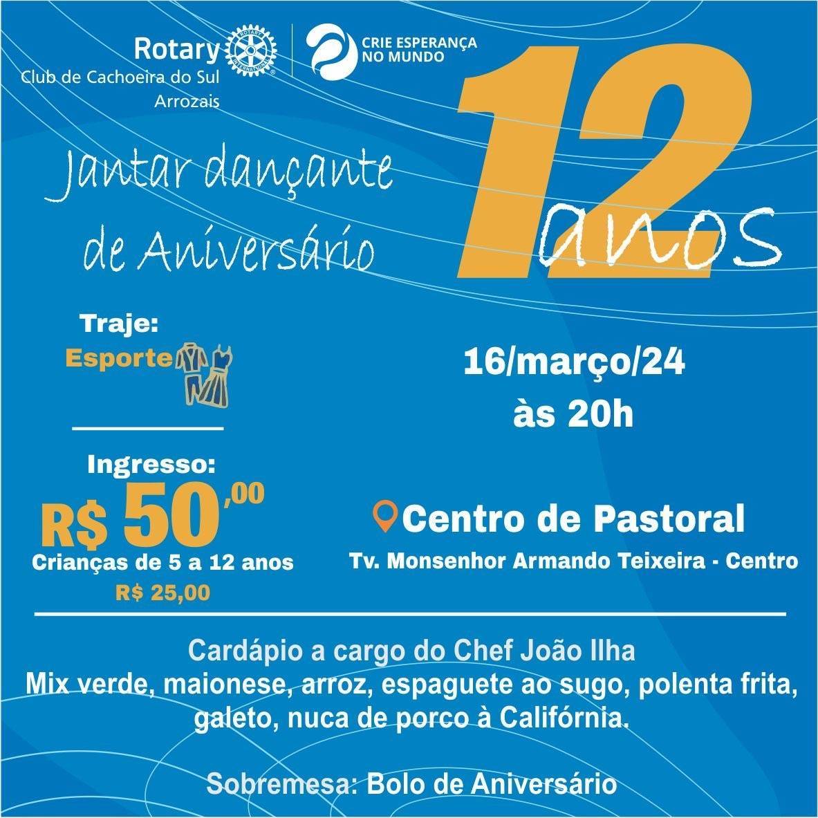 Vem aí mais um evento do Rotary Club de Cachoeira do Sul Arrozais, jantar dançante de aniversário de 12 anos de sua fundação. Será dia 16 de março, às 20h no Centro de Pastoral. Muita música, alegria, posse do Rotary Kids de Cachoeira do Sul e muita solidariedade. Buffet maravilhoso do Chef João Ilha e animação do DJ Alexandre Dionísio. Valor R$ 50,00 adulto (criança de 06 a 12 anos pagam R$ 25,00). Reserve seu convite com os rotarianos ou pelo Fone: (51) 9 9917 0184.