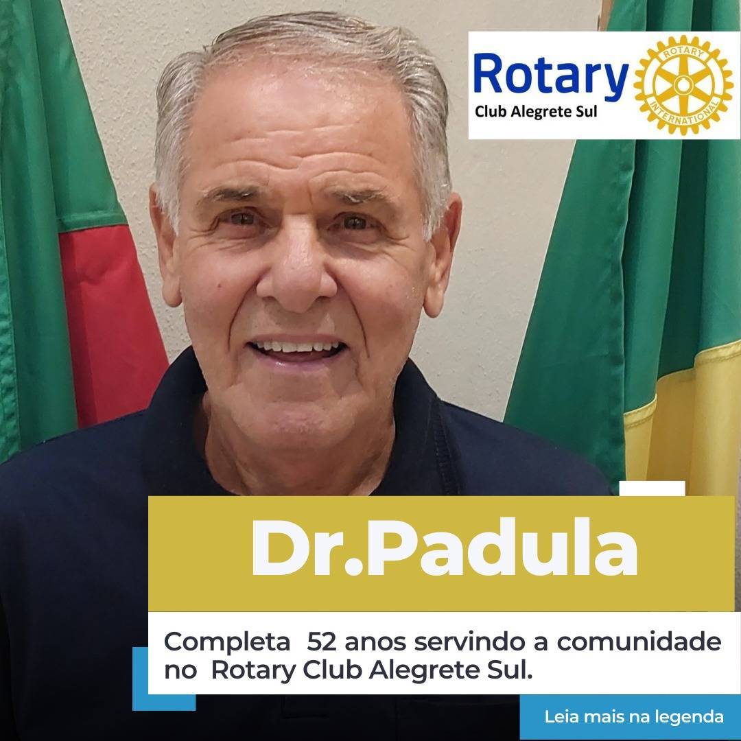 No ano que o Rotary Club Alegrete Sul completa 56 anos, o Cirurgião Dentista Angelo Rafael Naimayer Padula completa 52 anos de serviços prestados a comunidade no Rotary Club Alegrete Sul. Padula lembra com alegria e orgulho do início da sua participação no Rotary Sul , quando aceitou o convite do rotariano Aquiles Thadeu com o compromisso de servir a comunidade, especialmente a quem mais precisa. Lembra também dos grandes eventos e ações que ajudou como festival do Chopp, ações na exposição agropecuária do Alegrete, na campanha da pólio, na construção da Escola Municipal Princesa Isabel, da Escola Municipal Honório Lemes, do Albergue Municipal e o apoio ao Hospital da Santa Casa de Caridade de Alegrete, destacando o companheirismo do rotary como uma das forças motivadoras para vencer os desafios do apoio a comunidade. Ocupou várias funções no Rotary Sul como secretário, tesoureiro, presidente com atuação em todas as avenidas rotarias. Em 2025 Padula continua firme com sua participação no Rotary Sul, incentivando as novas gerações os princípios do Rotary Club internacional e a cultura de servir, com ênfase na mensagem de “ dar de si, antes de pensar em si”.
