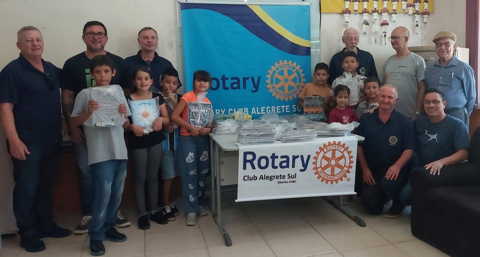 Continuando seu trabalho social pela educação, o Rotary Club Alegrete Sul esteve neste dia 18 de fevereiro de 2025 na Escola Municipal Ensino Básico Francisco Mafaldo – Pólo do Caverá - realizando a entrega de um conjunto de material escolar a alguns alunos indicados pela Direção. Os recursos para aquisição deste material são oriundos das arrecadações realizadas na Exposição Feira do Alegrete em parceria com o Sindicato Rural de Alegrete. A campanha segue com a entrega de kits em outras escolas do município. O Rotary Club Alegrete Sul continua firme em seus propósitos, realizando um serviço social à comunidade em diversas áreas. Fundado em 17 de novembro de 1969 (hoje com 55 anos de serviço comunitário), o Rotary Club Alegrete Sul faz parte do Rotary Internacional, associação de clubes de serviços cujo objetivo declarado é unir voluntários a fim de prestar serviços humanitários e promover valores éticos e a paz a nível internacional. Existem mais de 34 mil Clubes de Rotary no mundo, com cerca de 1,3 milhões de membros.