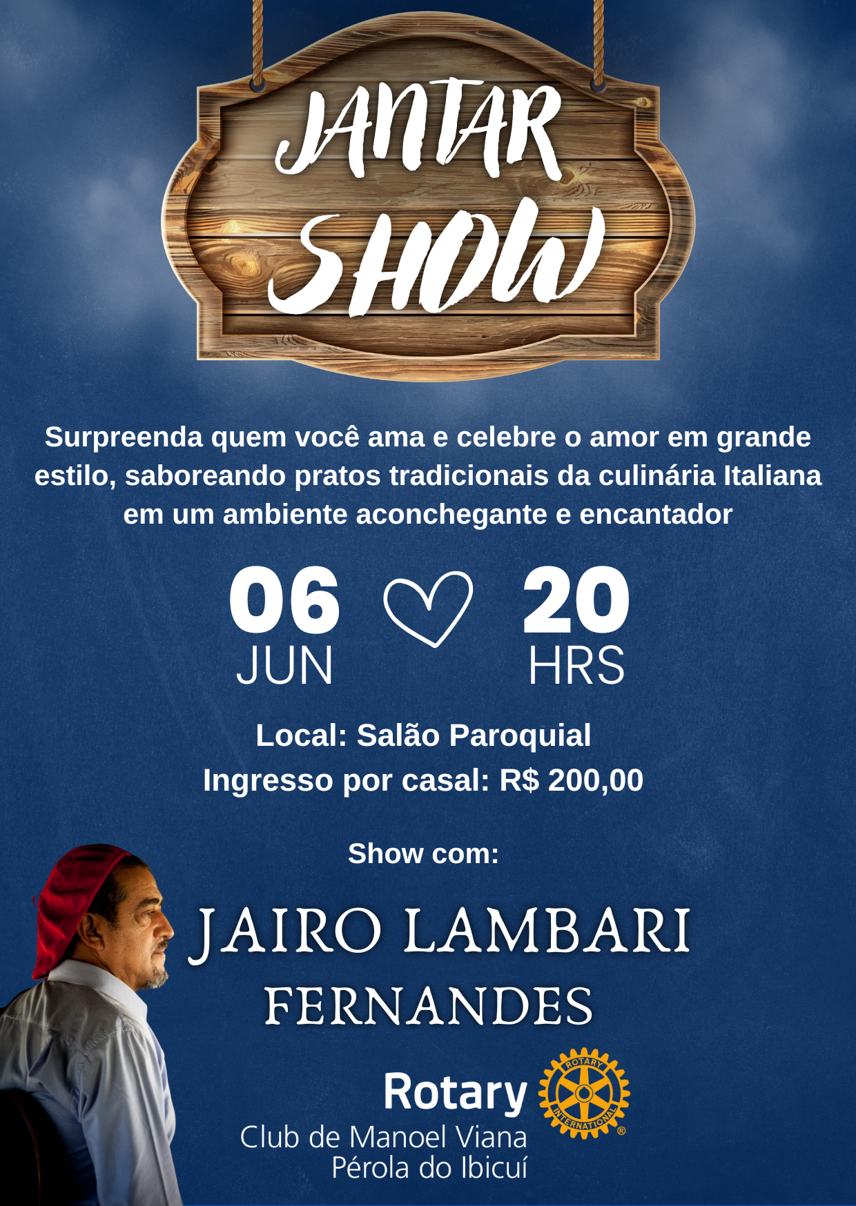 Que tal uma noite especial para celebrar o amor? O Rotary Club de Manoel Viana - Pérola do Ibicuí preparou um jantar típico Italiano, em um ambiente aconchegante, com boa música e momentos inesquecíveis para você e quem você ama.