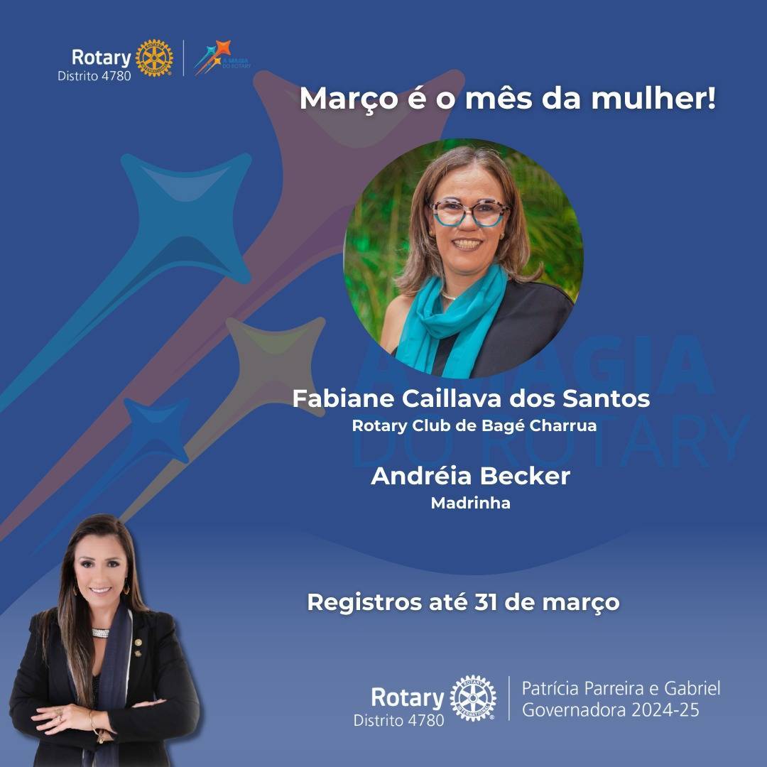 Em março mês da mulher e também mês de aniversário da Governadora Patrícia Parreira, o presente seria trazer uma nova associada, o Rotary Bagé Charrua realizou esse desafio e presenteou a Governadora, dando posse para a querida Fabiane Caillava, sua madrinha a Companheira Andréia Becker.
