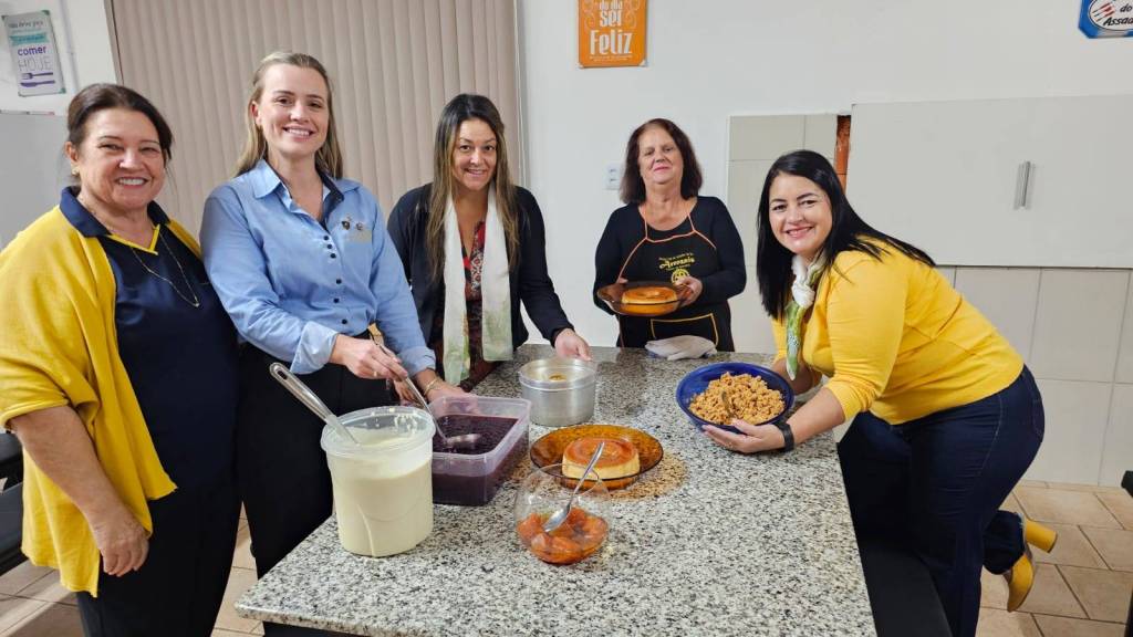 As companheiras festeiras Luana, Marisa, Monica, Nilza, Rosimeri e Vera organizaram com muito carinho o local (salão da APAE Cachoeira do Sul) e elaboraram um cardápio saborosíssimo (lasanhas).