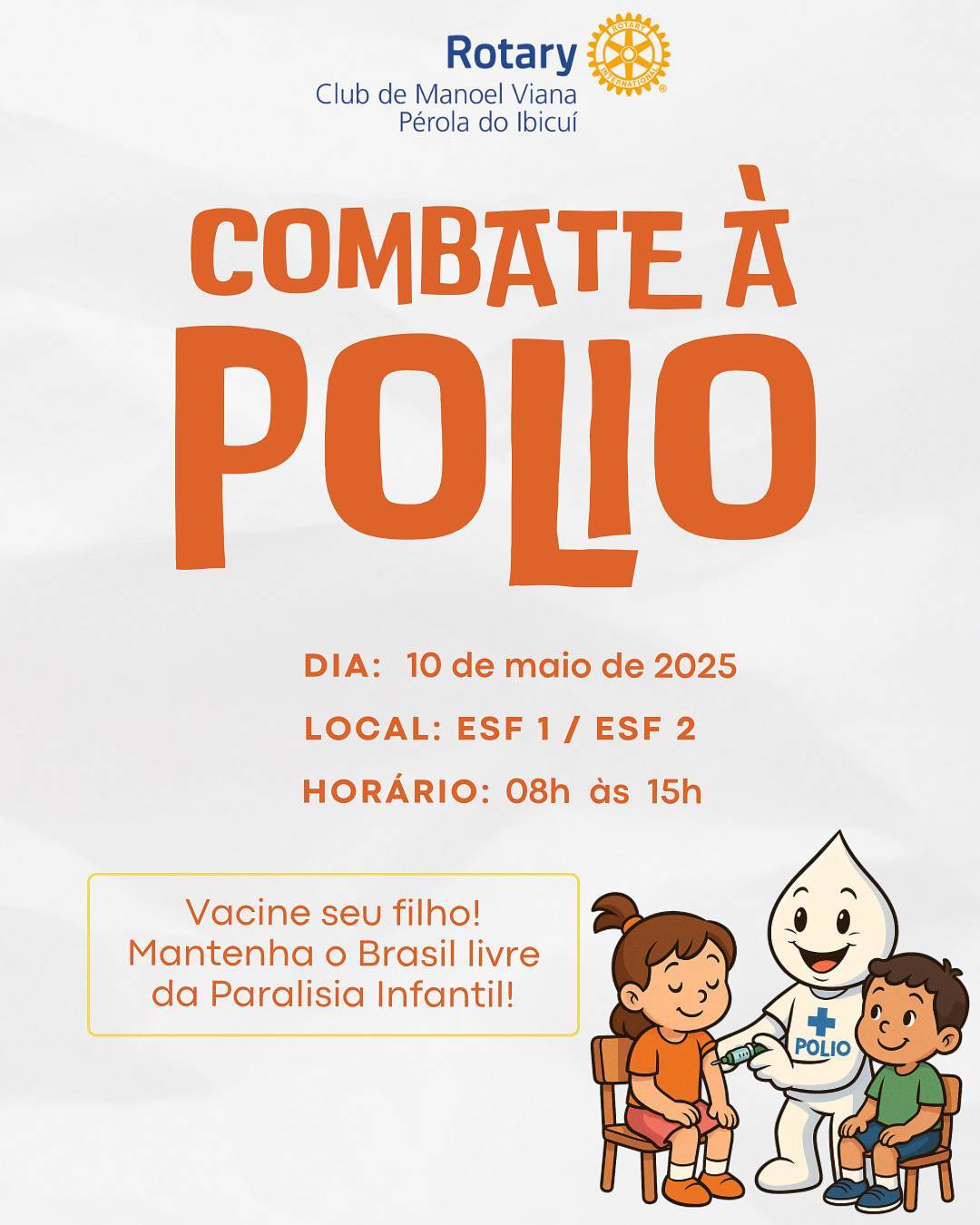 No dia 10 de maio, será realizada a Campanha de Vacinação em nosso município. Entre as vacinas disponíveis, estará a vacina contra a Poliomielite, essencial para a proteção das nossas crianças.