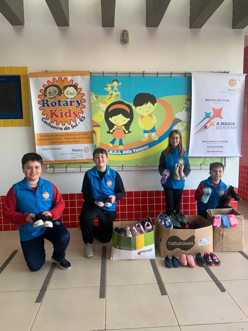 No dia 25/06/2025, o Rotary Kids de Cachoeira do Sul encerrou as ações do ano rotário 2024-2025, com a entrega de calçados e meias arrecadados na campanha solidária ‘Aqueça um Pezinho’, para a EMEI Júlia Tavares, sob a presidência da Kid Martina Bertolini e seus companheiros kidianos Antônio, Pedro Henrique e Vinícius. A ação foi coordenada pela companheira Cátia Sartório e a presidente Helenara da Rosa, do RC Arrozais, clube patrocinador dos Kids. Acompanharam a ação, as mamães Daiane, Juliana e Leila.