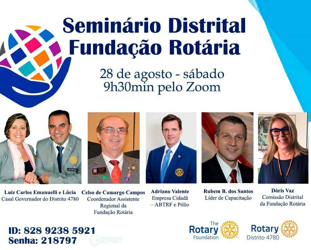 No dia 28 de agosto, sábado, o Distrito 4780 promove o Seminário Distrital da Fundação Rotária. Em razão da pandemia, as atividades distritais seguem sendo de forma remota, pela plataforma zoom. O encontro on-line inicia às 9h30min com diversos convidados: Coordenador Assistente Regional da Fundação Rotária, Celso de Carmargo Campos; Empresa Cidadã – ABTRF e Pólio, companheiro Adriano Valente e o Líder de Capacitação do Distrito 4780, Rubem Beraldo dos Santos. Conforme a Presidente da Comissão Distrital da Fundação Rotário, companheira Dóris Vaz o momento é de estrema importância, especialmente para certificar os clubes para apresentação de projetos distritais.